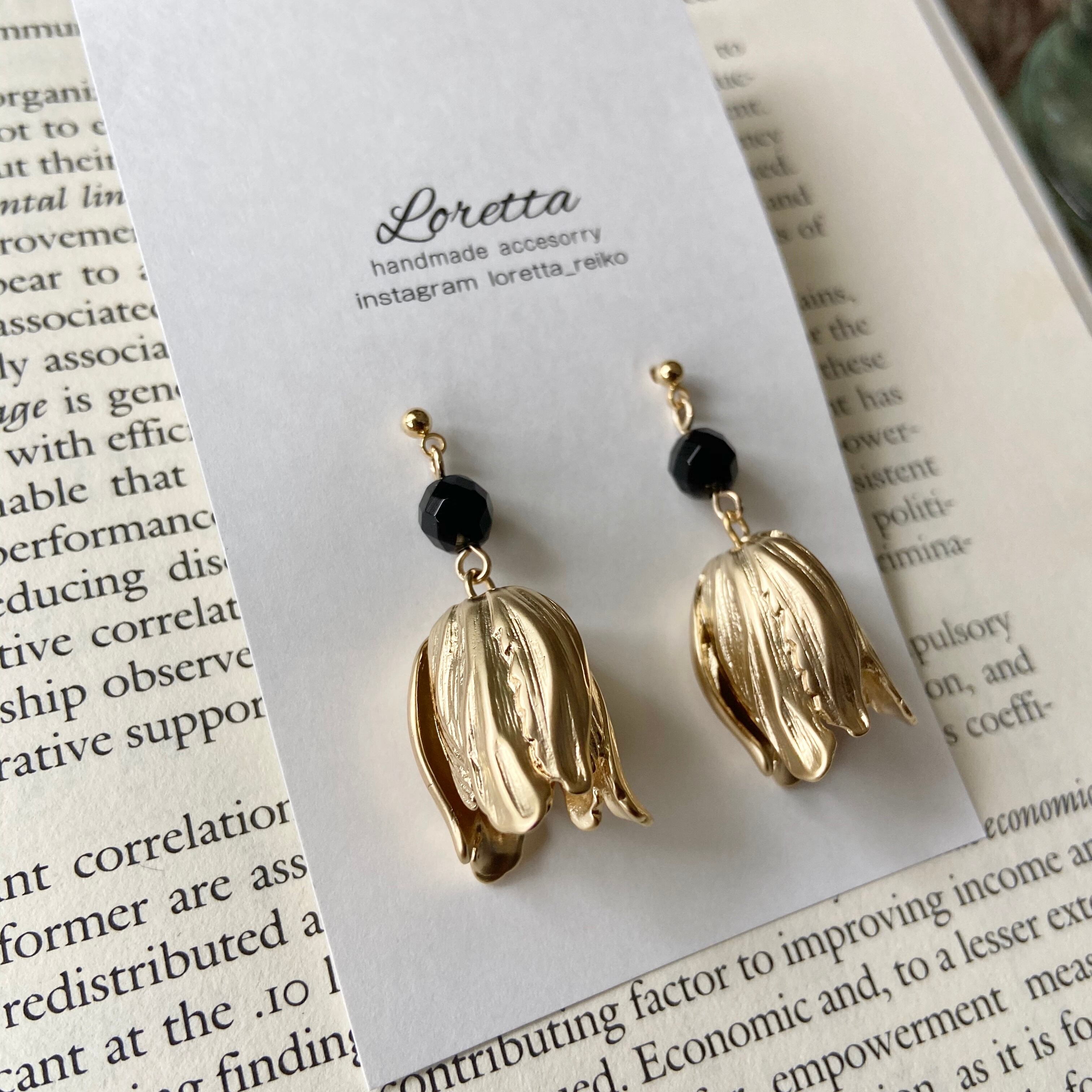 ブラックオニキスと大きなチューリップのピアス・イヤリング