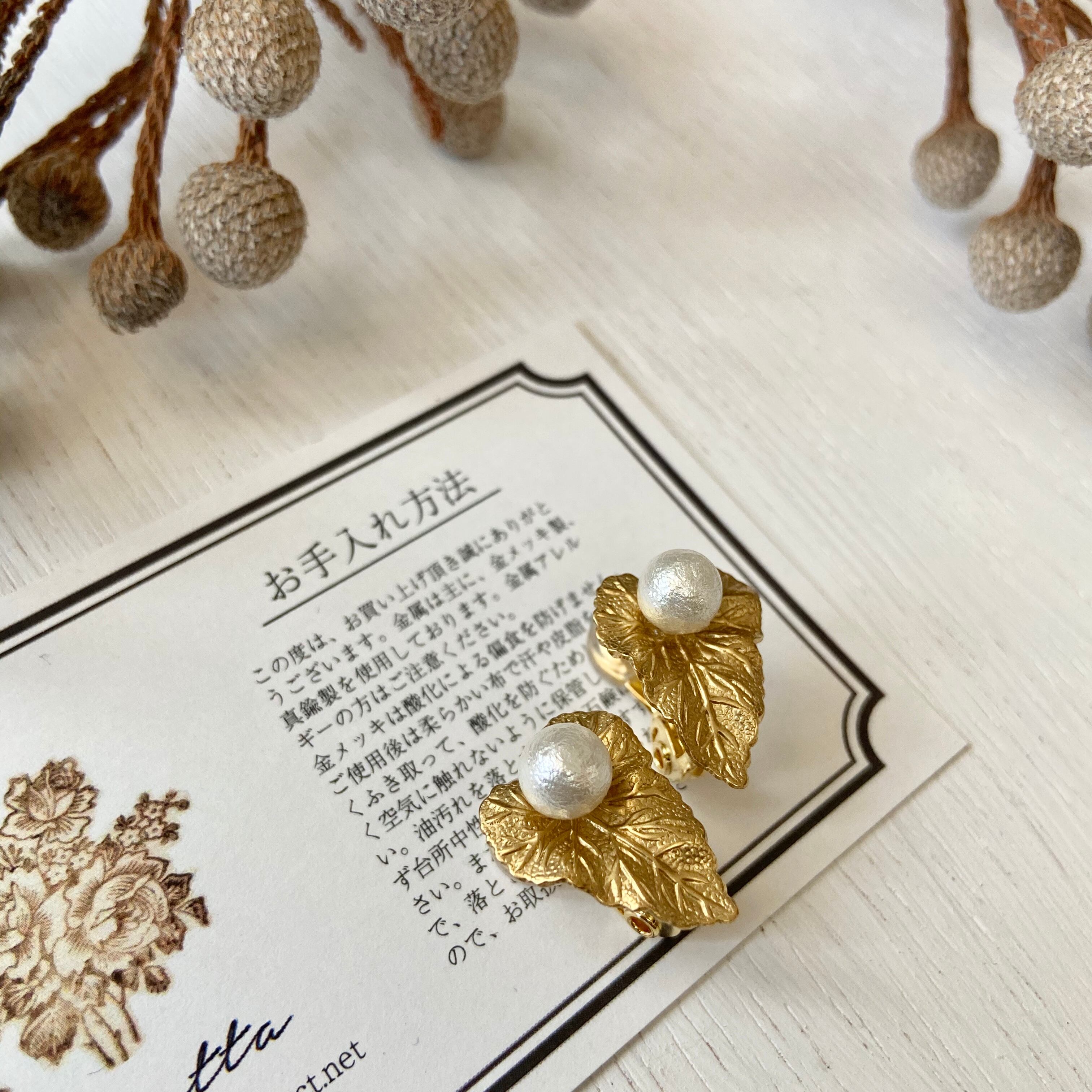 ゴールドのミニブラスリーフのシンプルなイヤリングです