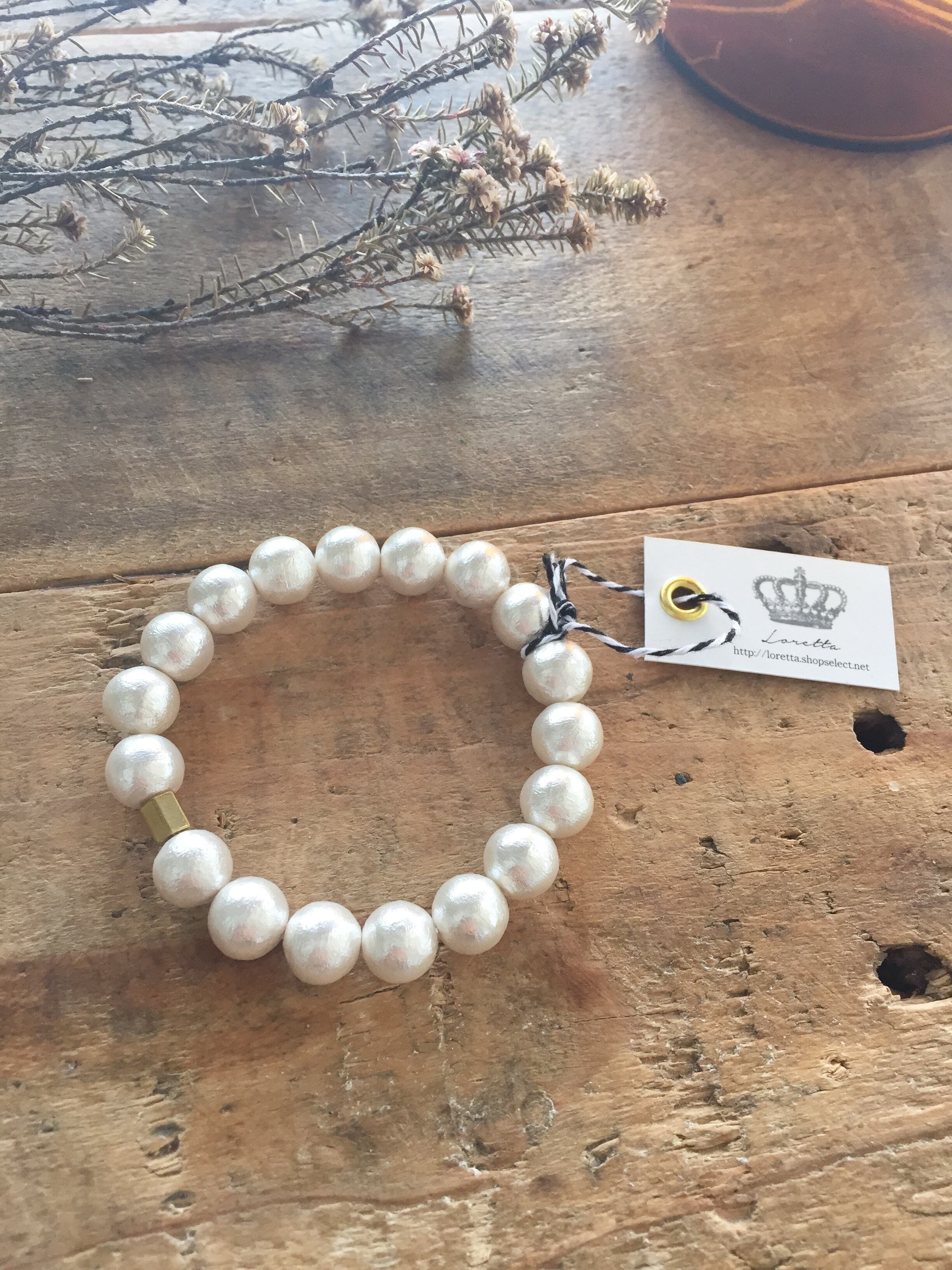 真鍮がアクセントのコットンパールゴムブレス